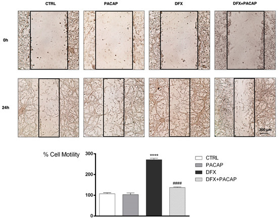 To evaluate whether PACAP affects GBM cells migration following hypoxic insult, we have performed wound healing assay. As shown in Figure 7, U87MG cells motility drastically increased after exposure to DFX for 24 h as compared to control (**** p < 0.0001 vs. CTRL). Instead, fewer cells grown under hypoxia mimetic condition moved toward the wounded area after PACAP-treatment (#### p < 0.0001 vs. DFX).