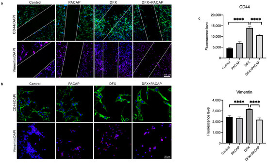 To characterize the phenotype of migrant cells along the scratch, we have evaluated the expression of vimentin and CD44 through immunofluorescence analysis. CD44 exerts a key role in GBM invasion [67]. In fact, it has recently demonstrated that GBM cells engage and invade hyaluronic acid-rich matrix through micro-tentacles expressing CD44 receptor [68]. As shown in Figure 8a, an abundant invasion of wound area by cells expressing high levels of CD44 and Vimentin has been observed under hypoxia mimetic condition. Interestingly, PACAP treatment reduced the migratory ability of mesenchymal cells exposed to DFX-induced hypoxia, as demonstrated by the reduced expression of both EMT makers (Figure 8a–c; **** p < 0.0001).