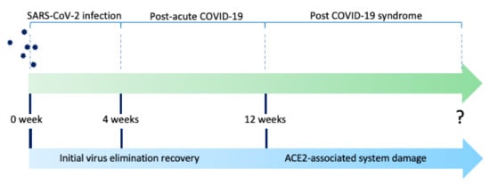 The timeline of Post-acute COVID-19 syndrome is defined as 4 to 12 weeks between initial confirmation of SARS-CoV-2 infection, while Post-COVID-19 syndrome is defined as 12 weeks after initial infection. The underlying progression/persistence of symptoms is associated with initial virus elimination recovery and angiotensin-converting enzyme 2 (ACE2)-associated system damage.
