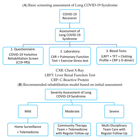 (A,B) Recommended rehabilitation model for patients with Long COVID-19 Syndrome.