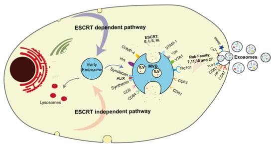The biogenesis of exosomes, starting from the early endosomes, including both endosomal-sorting complex required for transport pathway (ESCRT). In the ESCRT pathway family (in the upper half of the cell), four sub-proteins 0, I, II, III, and charged multivesicular body protein- 4 (CHMP-4), hepatocyte growth factor-regulated tyrosine kinase substrate (Hrs), Programmed cell death 6-interacting protein (ALIX), signal-transducing adapter molecule 1 (STAM-1), vacuolar protein sorting proteins (Vps), and tumor susceptibility gene 101 (TSG-101) are identified. The ESCRT independent pathway (in the lower half of the cell) includes tetraspanin protein (CD9, CD84, CD81, CD63, CD47) and syndecan-Syntenin-ALIX. Exosome release results from the interaction of the Rab family, including Rab-7, 11, 35, 27 with Tspan and the Soluble N-ethylmaleimide-sensitive-fusion attachment protein receptor (SNARE).