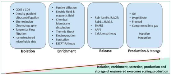 Otherwise, cargo enrichment of exosomes is the most critical step in their manipulation, and numerous approaches have been mentioned. Exosome lipid membranes can be temporarily disrupted by physical or chemical treatment, sonication, and freeze-thaw cycles [200,201,202]. The fact that exosomes are negatively charged, manipulating the surface charge using magnetic and electric fields will lead to the encapsulation of the molecules [203]. These approaches are non-specific and can negatively affect the integrity of the membrane leading to a low exosome recovery.
