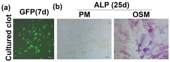 hMDSC can migrate out of the blood clot and undergo proliferation and osteogenic differentiation. (a) GFP+ hMDSCs migrated out from blood clot. Scale bar = 100 µm. (b) ALP staining of cells that migrated out from the blood clot cultured in proliferation medium (PM) and osteogenic medium for 25 days. Cells cultured in osteogenic medium express ALP, while cells cultured in PM (non-osteogenic) remain ALP-negative. Scale bar = 100 µm.