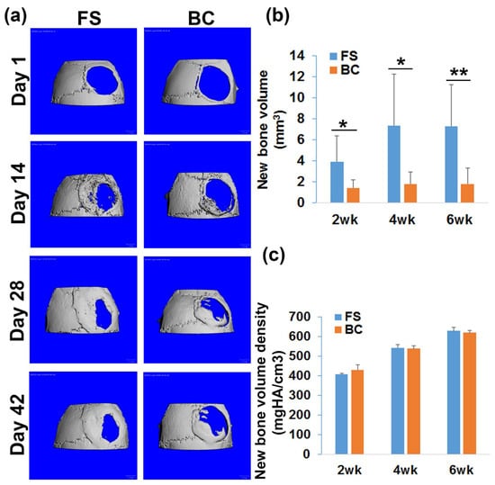 MicroCT analysis of bone regeneration. (a) MicroCT 3D images at different time points post-surgery. Scale bars = 1 mm. (b) Quantification of the new bone volume. There was significantly less new bone formed in the BC group than in the FS group. (c) New bone volume density quantification. Bone density increased as new bone matured. No statistically significant differences were found between the BC and FS groups. * p < 0.05, ** p < 0.01.