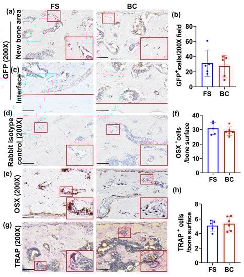 Histology staining of GFP donor cells and bone cells. (a) Immunohistochemistry of GFP for donor cells’ contribution to the regenerated bone. GFP+ cells showed in brown color on bone surface or in bone area. Few GFP+ cells were found in the bone surface (osteoblasts) and in the bone area (osteocytes). Insets are enlarged red box area to show GFP+ osteoblasts and osteocytes. Scale bars = 100 µm. (b) Quantification of GFP+ cells and normalized to cells/200× field. No statistical difference was found between the BC and FS groups. (c) GFP staining in the location of newly formed bone and the host–bone interface. The area above the red lines demonstrates new bone. GFP+ cells can be found on the bone surface or in the bone matrix for both groups in the newly formed bone area but not in the host bone area. Scale bars = 100 µm. (d) Rabbit isotype controls for both GFP and OSX staining of new bone area. All cells are negative. Scale bars = 100 µm. (e) Immunohistochemistry of OSX for osteogenic progenitor cells. OSX+ cells showed a brown color and were mainly located on the bone surface. Some osteocytes also expressed OSX. Insets are enlarged red boxed area to demonstrate OSX+ cells. Scale bars = 100 µm. (f) Quantification of OSX+ cells on the bone surface of newly regenerated bone. No statistical difference of OSX+ cells/bone surface was found between the BC and FS groups. (g) TRAP staining for osteoclasts. TRAP+ osteoclasts are seen in a violet-red color and exist as multinuclear or as single nuclear cells on the bone surface. Insets are enlarged red boxed area for TRAP+ cells. Scale bars = 100 µm. (h) Quantification of TRAP+ cells on the bone surface of the newly regenerated bone. No statistical difference was found between the BC and FS groups.