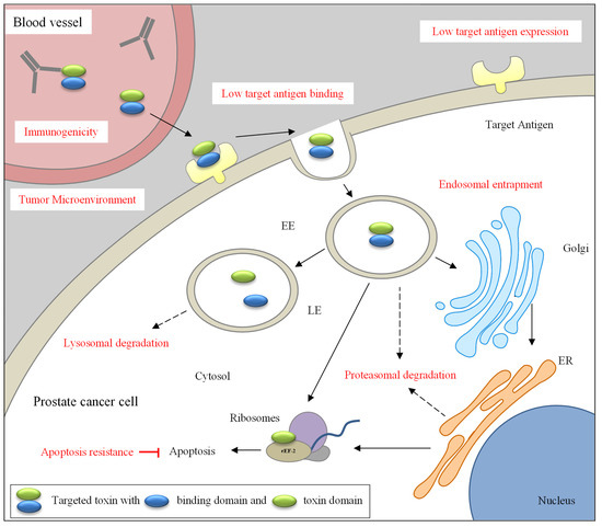 Intoxication of prostate cancer cells with targeted toxins and hurdles that might impair their efficacy. After systemic application targeted toxins are transported via the bloodstream to the tumor sites. They bind to antigens on the tumor cell surface and are internalized into early endosomes. After cleavage from the binding domain, the toxin domain is transported directly or via the Golgi network and the endoplasmatic recticulum into the cytosol. When RIP toxin domains are used, there is an inhibition of protein biosynthesis on the ribosomes with subsequent induction of apoptosis. Hurdles that might impair the efficacy of the targeted toxins are shown in red and comprise immunogenicity and low antigen binding of the targeted toxins, endosomal entrapment as well as lysosomal/proteasomal degradation during trafficking. Tumor cells can attenuate cytotoxicity by a dense tumor microenvironment, low antigen expression and apoptosis resistance. Abbreviations: EE, early endosomes; ER, endoplasmatic reticulum; LE, late endosomes.