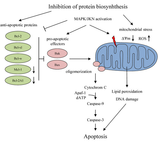 Molecular mechanisms that lead to the induction of apoptosis after inhibition of protein biosynthesis are not yet fully understood and appear to be toxin- and cell-dependent. In PC cells, PE-based targeted toxins have been shown to degrade anti-apoptotic Bcl-2 proteins, specifically Mcl-1 and Bcl-2A1 [18,19]. This results in an activation of the pro-apoptotic effectors Bak and Bax followed by cytochrome C release from the mitochondria and induction of apoptosis (Figure 2). In addition, protein biosynthesis inhibition can directly induce mitochondrial stress, lipid oxidation, DNA damage, and thus apoptosis. In addition, MAPK/JNK activation might be involved, leading to an upregulation of pro-apoptotic effector proteins, downregulation of anti-apoptotic proteins, and triggering of mitochondrial stress (rev. in [20]).