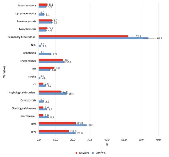 In terms of demographic characteristics and according to the classification of HIV disease and infection, made by the United States Agency, the Centers for Disease Control and Prevention (CDC), there are no statistically significant differences between the two groups (Table 1). A significantly higher number (F = 4.662. p = 0.031) of comorbidities was noticed in patients in group 1 (DRV/r), then in group 2 (DRV/c), as it is depicted in Figure 1.