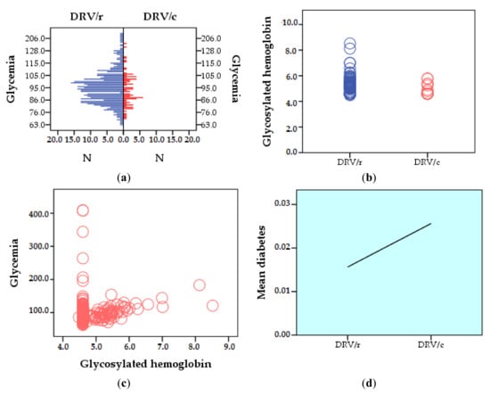 In the group exposed to DRV/r, approximately 8% of patients have above normal blood glucose values (>115 mg/dL) and 12.72% have normal/high values (105–115 mg/dL). For patients in group 2, DRV/c, the blood glucose values are within normal limits (75–115 mg/dL) for 97.44% of the subjects, the remaining of 2.56% having high values (Figure 3a). According to the values of glycosylated hemoglobin, in the group exposed to DRV/r, 5 patients have diabetes (>6.5%) and 15 patients have prediabetes (5.6–6.4%) condition. Most patients in group 2 have values that are concentrated in references ranges (4.8% and 5.5%). Only two patients, 2.6%, of those exposed to DRV/c were found in the prediabetes condition (Figure 3b). The Pearson correlation for the two parameters, glycemia and glycosylated hemoglobin has statistical significance (r = 0.144, p = 0.002) (Figure 3c). Statistical analysis showed a mean value of the prevalence of pre-existing diabetes of 0.0156 (SD ± 0.012) for the first group and a higher mean value of 0.0256 (SD ±0.1590) for the second group, with statistically significant difference (p < 0.05) (Figure 3d). Correlating with the Pearson coefficient, the three parameters (pre-existing diabetes, serum blood glucose levels, and glycosylated hemoglobin) results indicates a strong positive correlation, as follows: pre-existing diabetes and blood glucose level (r = 0.120, p = 0.010); pre-existing diabetes and glycosylated hemoglobin (r = 0.443, p = 0.001) (Figure 3e).