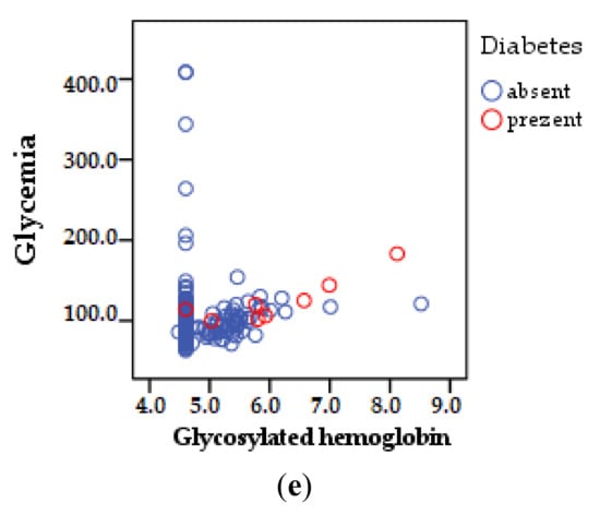 Comparative carbohydrate profile between groups: (a) glycemia (mg/dL); (b) glycosylated hemoglobin (%); (c) Pearson correlation between blood glucose and glycosylated hemoglobin; (d) Pearson correlation regarding the prevalence of diabetes; (e) Pearson correlation pre-existing diabetes, blood sugar, and glycosylated hemoglobin (comparative histogram and dot cloud, SPSS).