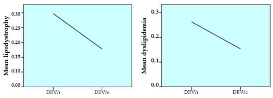 Comparing the prevalence of lipodystrophy in the two groups, the results showed insignificant differences (35.4%-DRV/r vs. 33.3%-DRV/c). Pre-existing dyslipidemia (before the present regimen) occurs in 28.6% of patients in the DRV/r group, compared to 15.3% in the DRV/c group (Table 5).