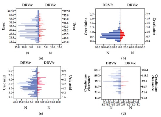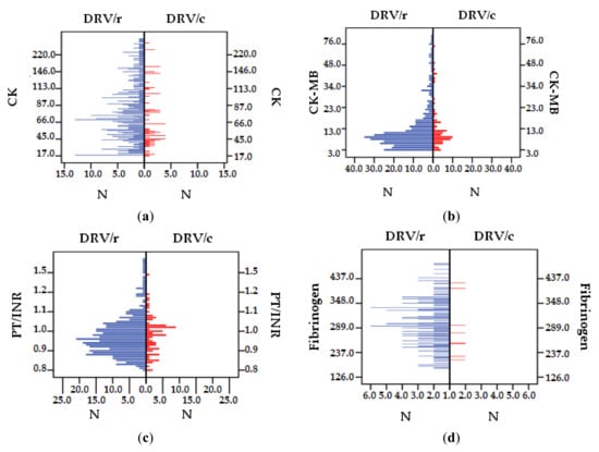Regarding CK, NV < 170 IU/L, the highest value exceeds 329 IU/L for several patients exposed to DRV/r (Figure 5a). The isoenzyme CK-MB (NV 2–10 IU/L) exceeds the reference range, in both groups, but the highest value was registered in DRV/r group (Figure 5b). PT/INR (NV 0.8–1.18) has higher values at DRV/r than DRV/c, but the mean value is within reference range (Table 7). However, in group 1 there are several patients (2.60%) with values above normal, with a maximum of 3.45, while in DRV/c group there is only one patient with values above the normal limit, 1.58 (Figure 5c). For fibrinogen (NV 200–400 mg/dL2) the most dangerous values are those <100 and >700. The lowest value (126 mg/dL2) as well as the highest (738 mg/dL2) are found in DRV/r group (Figure 5d). All patients exposed to DRV/c have serum fibrinogen values within normal limits (Table 7).