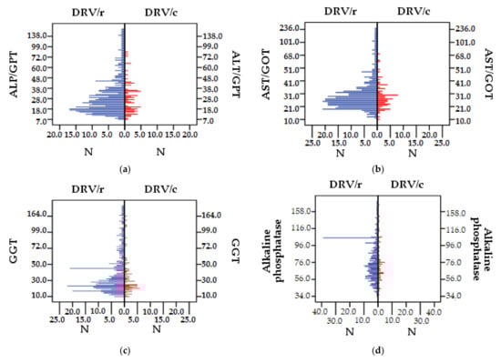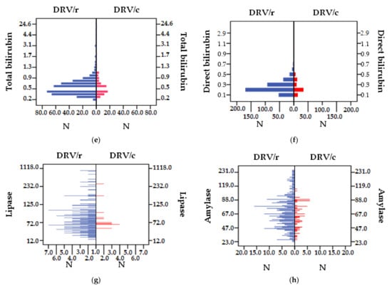 For seric lipase (NV 23–300 IU/L), in the DRV/r group, 8.59% of patients had values above normal limits compared to 5.12% in the group exposed to DRV/c. However, the mean values fall within the reference range. Outcomes <23 IU/L were found for only three patients in the entire cohort (two in the first group, and one in the second group). Descriptive statistics of liver and pancreatic function parameters are presented in Table 9 and the distribution of the values of the analyzed parameters, compared between group in Figure 6a–h.