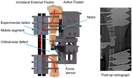 Configuration of the experimental setup. The distal and proximal parts of the tibia are fixed with an external fixator which transfers physiological loading (red line). The mobile fragment is connected to the proximal part via an active fixator that moves it to stimulate and monitor healing in the experimental defect.