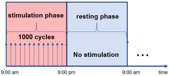Pictorial representation of the stimulation protocol. Every day, 1000 stimulation cycles were equally distributed from 9:00 a.m. to 9:00 p.m. (stimulation phase) and no stimulation was applied overnight (resting phase). The stimulation protocol was applied from the first day post-op for the entire duration of the study. The arrows represent the applied stimulation and the dots (…) indicate that the same protocol was recuring every day.