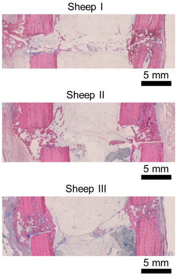 The animals were euthanized nine weeks post-op by an overdose of Pentobarbital. The operated bones were dissected, fixed in 70% ethanol, dehydrated and embedded in resin. Subsequently, the specimens were sliced into 100 µm sections and stained with Giemsa-Eosin. A certified veterinary pathologist performed a descriptive qualitative analysis of the stained sections to assess the healing progression and detect potential infection or bone necrosis.