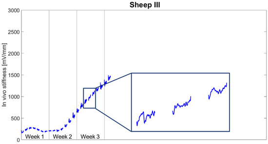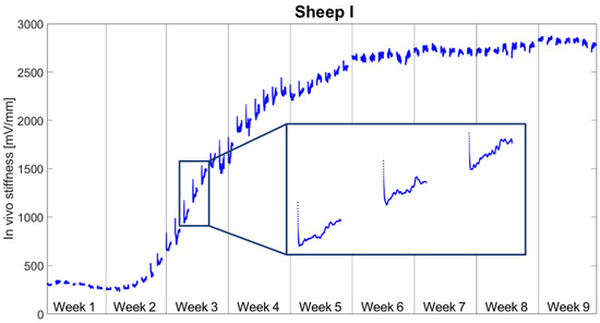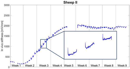 Figure 4 reports the daily stiffness measurements for Sheep I. Each cluster of points represents data collected during daily cycles from 9:00 a.m. to 9:00 p.m. After an initial plateau phase, the stiffness began to increase at Day 10. From Week 6 onwards, the stiffness plateaued again. In the interval when the stiffness was rising, a characteristic pattern was observed: the stiffness value dropped sharply within the first stimulation cycles of the day followed by a slow rise in stiffness to the end of the 12 h stimulation phase. During the stimulation phase, the stiffness decreased until reaching an average of 87.3 ± 7.9% and rose until the end of the day to the level of 94.3 ± 7.3% of the initial daily stiffness.