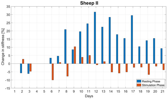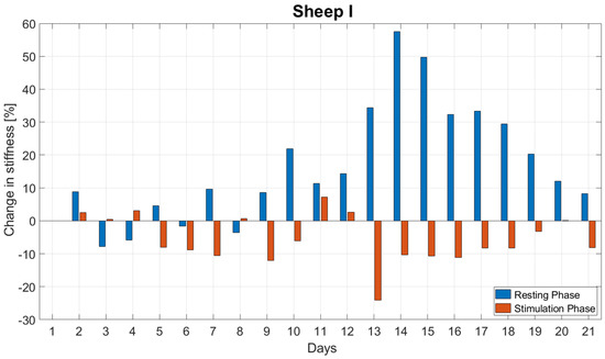 The stiffness increased during the resting phases on average by 16.9 ± 17.9% per day. In contrast, during stimulation it decreased on average by 5.7 ± 7.3% per day (Figure 5). The stiffness change during resting was significantly greater than during stimulation (p < 0.001).