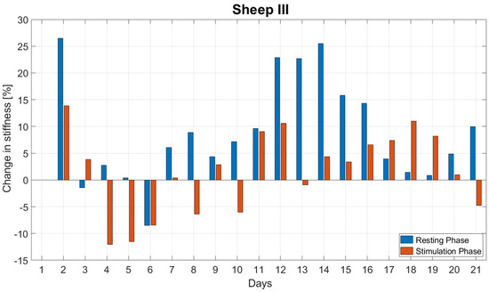 Figure 8 reports the daily stiffness measurement for Sheep III. Following minor fluctuations during the first week, stiffness started to continuously increase from the 10th day post-op until the force sensor broke 24 days post op. The stiffness drop pattern as observed in both previous sheep was less frequently present in this animal. During the stimulation phase, stiffness decreased until reaching an average of 91.6 ± 4.3% of the initial daily stiffness and rose until the end of the day to 101.6 ± 7.7% of the initial daily stiffness. The normalized stiffness increased on average by 8.9 ± 9.6% per day during the resting phases and on average by 1.6 ± 7.7% per day during the stimulation phases (Figure 9). The stiffness change during resting was significantly greater than during stimulation (p = 0.003).