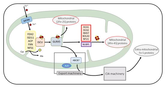 The mitochondrial process can itself be subdivided in three main steps. First, an initial [2Fe-2S] 2+ cluster is built de novo on the scaffold protein ISCU by assembling two Fe2+ ions imported into the mitochondrion by the inner mitochondrial membrane transporters, called mitoferrins [23], and two sulfide ions produced from the desulfuration of the cysteines by the NFS1-ISD11-ACP complex [24,25,26]. This first step also requires electrons provided by the ferredoxin FDX2 [27,28,29] and is regulated by frataxin according to a still debated mechanism [30,31]. The newly made [2Fe-2S]2+ is then released from ISCU and transferred to the monothiol GLRX5 with the help of the HSPA9/HSC20 chaperone pair. However, recent studies have proposed that ISCU could transfer its cluster to not only GLRX5 but also to specific mitochondrial [2Fe-2S] proteins containing conserved LYR motifs [32,33]. Finally, the GLRX5-bound cluster can be directly inserted into mitochondrial [2Fe-2S]-containing proteins that are then exported out of the mitochondrion or are converted to a [4Fe-4S] cluster.