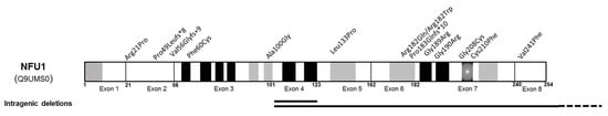 - Navarro-Sastre, A.; Tort, F.; Stehling, O.; Uzarska, M.A.; Arranz, J.A.; del Toro, M.; Labayru, M.T.; Landa, J.; Font, A.; Garcia-Villoria, J.; et al. A Fatal Mitochondrial Disease Is Associated with Defective NFU1 Function in the Maturation of a Subset of Mitochondrial Fe-S Proteins. Am. J. Hum. Genet. 2011, 89, 656–667. [Google Scholar] [CrossRef]