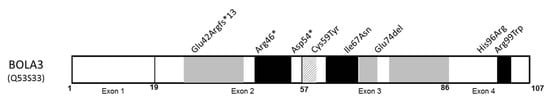 - Haack, T.B.; Rolinski, B.; Haberberger, B.; Zimmermann, F.; Schum, J.; Strecker, V.; Graf, E.; Athing, U.; Hoppen, T.; Wittig, I.; et al. Homozygous Missense Mutation in BOLA3 Causes Multiple Mitochondrial Dysfunctions Syndrome in Two Siblings. J. Inherit. Metab. Dis. 2013, 36, 55–62. [Google Scholar] [CrossRef]