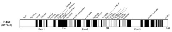 Schematic of IBA57 protein (NP_001010867) with reported variants. Schematic secondary structure shows α-helix (grey), β-strand (black), and turn (grey and white crosshatches) (adapted from UniprotKB, protein Q5T440).