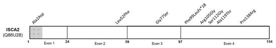 Biochemical analyses including an RC functional study showed that all complexes might be affected [93] but the activity of complexes III and V were rarely decreased in the tissues of patients with ISCA2 deficiency [50,89]. Lipoylated proteins (PDH, KGDH) were also decreased in the fibroblasts of patients, in accordance with the involvement of ISCA2 in the maturation of mitochondrial [4Fe-4S] proteins [94]. Interestingly, mitochondrial morphology with mitochondrial network disruption was abnormal in the fibroblasts of ISCA2 deficient patients [89]. Mitochondrial DNA depletion was also present in several studies, including in fibroblasts from Saudi ISCA2 deficient patients [86,89]. This variant seemed to be a founder mutation in Saudi families, while in five other patients from different countries, seven sporadic variants were identified. These seven variants affect all regions of the ISCA2 protein (Figure 5).