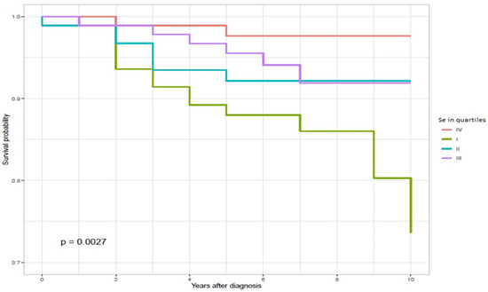 Ten-year survival by serum selenium levels (quartiles) in MM patients.