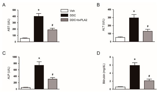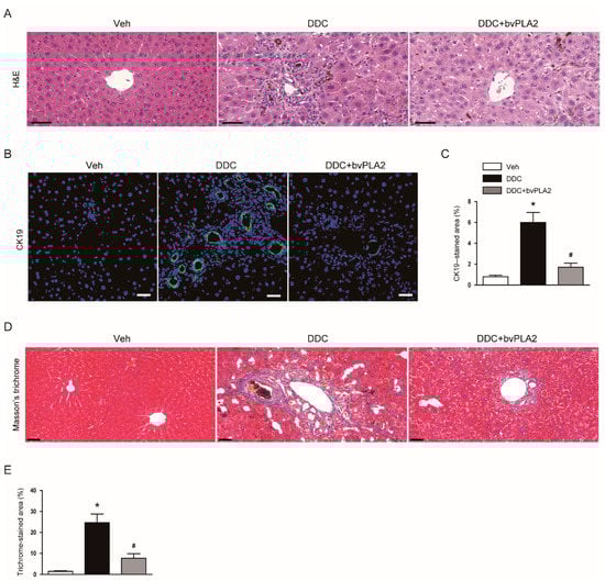 3.1. Administration of bvPLA2 Ameliorated Cholestatic Liver Injury and Fibrosis in DDC Diet-Fed Mice