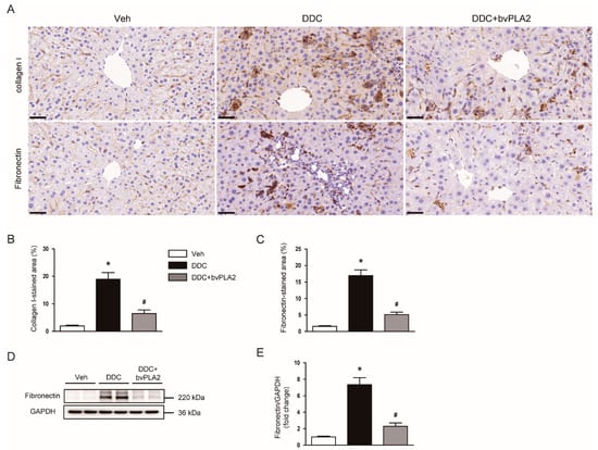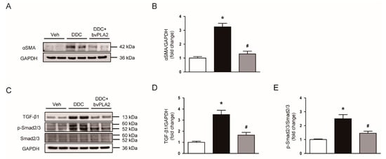 3.2. Administration of bvPLA2 Inhibited Expression of Extracellular Matrix Proteins, Myofibroblast Accumulation, and TGF-β Signaling Pathway in DDC Diet-Fed Mice