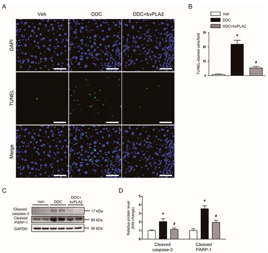 3.3. Administration of bvPLA2 Attenuated Apoptotic Cell Death in DDC Diet-Fed Mice