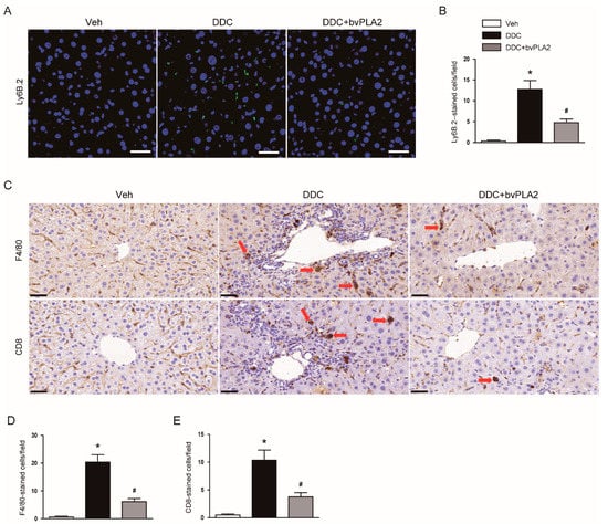 3.5. Administration of bvPLA2 Modulated Immune Cell Infiltration in DDC Diet-Fed Mice
