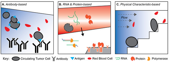 Platforms for circulating tumor cell isolation can be split into three main principles: (A) antibody-based, which utilizes antibodies to capture cell surface markers commonly expressed on circulating tumor cells (e.g., EpCAM), (B) RNA and protein-based, which detect the presence of CTCs based on either expressed RNA and/or secreted proteins, and (C) physical characteristic-based protocols, which capture CTCs from whole blood based on anticipated physical differences in CTCs and other cell populations such as red blood cells.