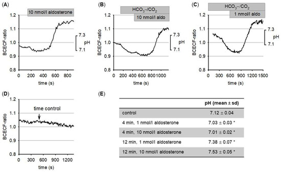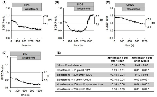 To characterize the aldosterone-induced pH changes in more detail, we used a pharmacological approach. We tested the effect of EIPA (a well-established Na+/H+-exchange inhibitor [47]) and DIDS (an inhibitor of Cl− and HCO3− transport [53]). As shown in Figure 2A, EIPA (10 µmol/L) completely prevented aldosterone-induced alkalinization.