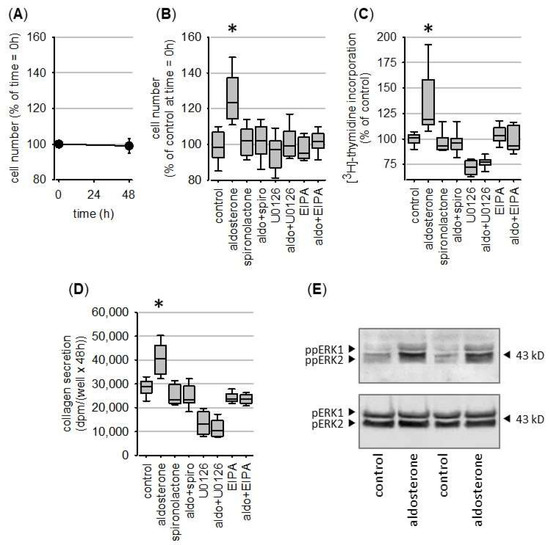 (A) Cell number is stable over a 48 h period in minus media. (B,C) Aldosterone (aldo, 10 nmol/L) induced proliferation of GMC proliferation is prevented by inhibition of Na+/H+-exchange (EIPA), by inhibition of ERK1/2-phosphorylation (U0126) and by blockade of the mineralocorticoid receptor (spiro). N = 10. * = p < 0.05 versus respective control. (D) Aldosterone (aldo, 10 nmol/L) induced proliferation collagen secretion is prevented by inhibition of Na+/H+-exchange (EIPA), by inhibition of ERK1/2-phosphorylation (U0126) and by blockade of the mineralocorticoid receptor (spiro). N = 8. * = p < 0.05 versus respective control. (E) Aldosterone (10 nmol/L, 15 min) enhances ERK1/2 phosphorylation (ppERK1/2).