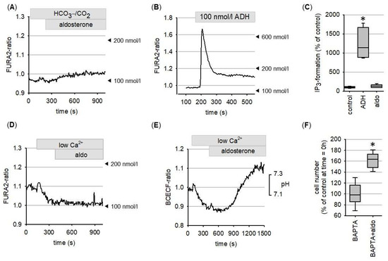 (A) Aldosterone (10 nmol/L) induces only a minor increase in cytosolic Ca2+, in contrast to (B) 100 nmol/L ADH. (C) ADH but not aldosterone induces the formation of IP3 (N = 5). (D) At low extracellular Ca2+, to prevent relevant Ca2+ influx, aldosterone induces no increase of cytosolic Ca2+. (E) Aldosterone-induced alkalinisation and (F) aldosterone-induced increase in cell number are independent of extracellular Ca2+ (N = 10). * = p < 0.05 versus respective control.