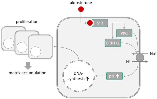 MR activation, e.g., by aldosterone, is part of progressive inflammatory renal damage independently of blood pressure [61], and the glomerular mesangium seems to be a major target. Our data suggest that the underlying pathomechanisms leading to glomerular mesangial injury include ERK1/2- and NHE1-induced proliferation of GMC and thereby to glomerular hypercellularity and dysfunction. Knowledge of the cellular mechanisms leads to a better understanding of the pathophysiology of renal injury and may help to develop therapeutic strategies.