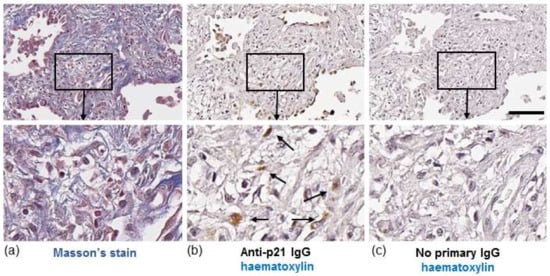 Histochemical staining of IPF lung. (a, left panel) Masson’s trichrome staining for collagen in a lung section from an IPF patient. Images show fibrotic mass comprising collagen and fibroblasts. (b, middle panel) A serial section from the same region of lung stained with hematoxylin (blue/purple) and p21 (brown). Images show p21-positive fibroblast-like cells (brown, highlighted by arrows). (c, right panel) No primary antibody control. Scale bar = 100 μm. Images in bottom row are enlarged areas of corresponding images in top row (10× magnification).