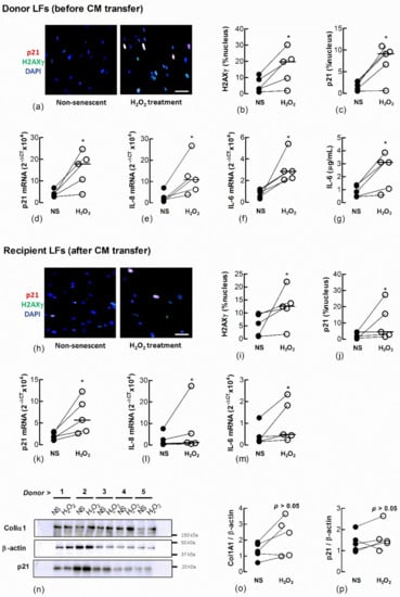 To determine if senescent LFs secrete factors that induce senescence in naïve fibroblasts we induced senescence by treating Ctrl-LFs with H2O2 and examined the effect of CM from these cells on naïve fibroblasts (Figure 3). They expressed a senescent phenotype 3 days after a 2 h exposure to 150 μM H2O2. The cells had an increase in the expression and nuclear localisation of p21, formation of nuclear H2AXγ and the expression or production of IL-6 and IL-8, archetypal SASP cytokines (Figure 3a–g). When naïve Ctrl-LFs were cultured with CM from H2O2-treated Ctrl-LFs for an additional 3 days, the cells showed increases in senescence markers, including levels of p21, IL-6 and IL-8 mRNA and increases in the levels and nuclear localisation of H2AXγ and p21 (Figure 3h–m) (p < 0.05, n = 5). The levels of p21 and ColIα1 protein in cell lysates were also higher in four of five cultures compared to CM from non-treated cells (Figure 3n–p).