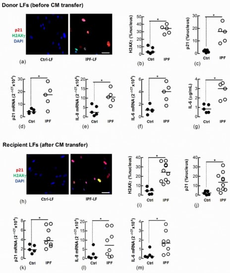 We and other laboratories have shown that IPF-LFs have a higher baseline of senescence than age-matched Ctrl-LFs [,]. To further explore the transfer of LF senescence, naïve Ctrl-LFs were cultured with CM from IPF-LFs for 3 days. The IPF-LFs used in this study were derived from five separate IPF patients and exhibit a senescence-like phenotype, as shown by the increased expression and/or levels of p21, nuclear H2AXγ, IL-6 and IL-8 when compared with Ctrl-LFs (n = 5) (Figure 4a–g). CM from IPF-LFs induced senescence in naïve recipient Ctrl-LFs (Figure 4h–m).