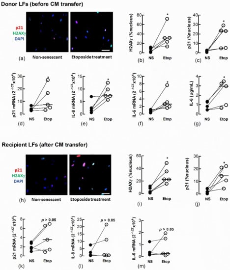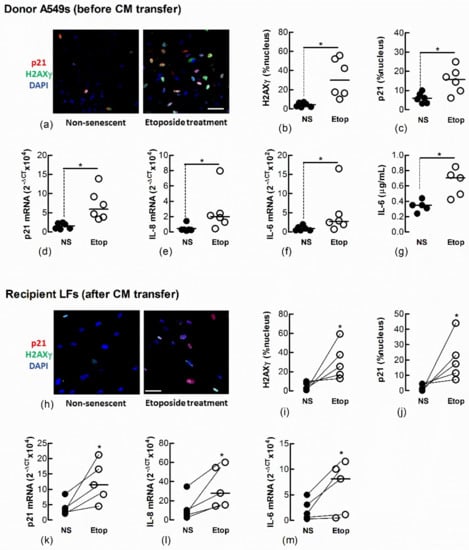 We also showed a transfer of senescence to naïve recipient Ctrl-LFs by treating Ctrl-LFs with CM from either LFs (Figure 5a–g) or AECs (Figure 6a–g) treated with the DNA topisomerase inhibitor, etoposide (Etop); an inducer of DNA damage and senescence (Figure 5h–m and Figure 6h–m) [].