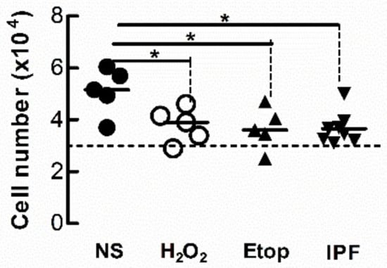 Conditioned medium from senescent fibroblasts reduces proliferation of naïve fibroblasts. Sub-confluent naïve Ctrl-LFs were exposed to CM (containing 0.4% FCS) from senescence-induced Ctrl-LFs using H2O2 or etoposide, or IPF-LFs with a higher baseline of senescence for 3 d before the medium was replenished with fresh medium containing 5% FCS. After an additional 2 days, cells were harvested and enumerated. The dashed horizontal line represents the initial number of cells seeded per well. (* p < 0.05).