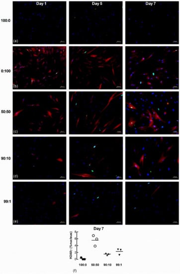 Nuclear H2AXγ, another marker of senescence, was also examined in the co-cultured cells. A larger number of H202-treated fibroblasts expressed nuclear H2AXγ staining 1 d after seeding (Figure 9a–e) but by 7 days a larger proportion of untreated LFs co-cultured with H2O2-treated cells expressed H2AXγ, even at the highest ratio of non-treated to senescence-induced cells seeded (99:1) (Figure 9f, n = 3).