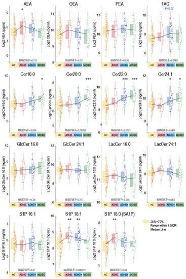 All ceramides linearly increase with age, and Cer18:0 increases with BMI (Supplementary Figure S2). Since ADHD patients without comorbidities were younger (≤40 years old), this could lead to spurious associations. To address this potential, confound, data were reanalyzed with a subgroup of HC ≤ 40 years of age. The result was robust for the key candidate lipids profiles. Ceramides of ADHD patients without comorbidities (ADHD-only) were in the normal range, and AEA and S1Pd18:1/S1Pd18:0 were elevated.