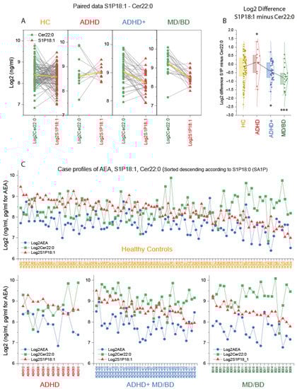 Key candidate lipids were selected based on the CanDisc structure, and case profiles of the three top lipids were further compared. Paired analyses of the individual’s Cer22:0 and S1Pd18:1 levels show that MD/BD patients “always” had higher Cer22:0 than S1Pd18:1, except for one patient (Figure 3A). This pattern appears to be inverted in ADHD, except for two patients. One was a 37-year-old male suffering from obesity (BMI 37), diabetes mellitus, and hypertension. The other was a 26-year-old male without metabolic reason for high Cer22:0, but a serious trauma in his medical history. The Cer22:0/S1Pd18:1 ratio (Log2 difference) differed significantly between groups (Figure 3B). The case profiles of S1Pd18:1, Cer22:0, and AEA were further compared and sorted according to the S1Pd18:0 level. Despite some overlap with the healthy controls, the profile changes according to the diagnosis suggested a disease-specific pattern.