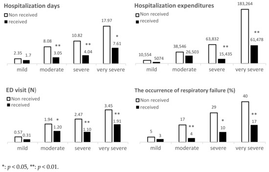 Table 2 and Figure 2 show that influenza vaccination was associated with medical utilization among COPD patients with different severities of airflow obstruction. For hospital utilization, the influenza vaccination group was lower in moderate, severe, and very severe COPD patients than the non-vaccination group (p < 0.001), but there was not a significant difference in mild COPD patients (p = 0.137). There were fewer hospitalization days noted among moderate (p < 0.001), severe (p = 0.002), and very severe COPD patients (p = 0.017) in the vaccination group than in the non-vaccination group, but there was not significant difference among mild COPD patients (p = 0.582). The total hospitalization expenditure of the influenza vaccination group was lower among severe (p = 0.001) and very severe COPD patients (p = 0.006) than in the non-vaccination group, but there was not significant difference among mild (p = 0.338) and moderate COPD patients (p = 0.440).