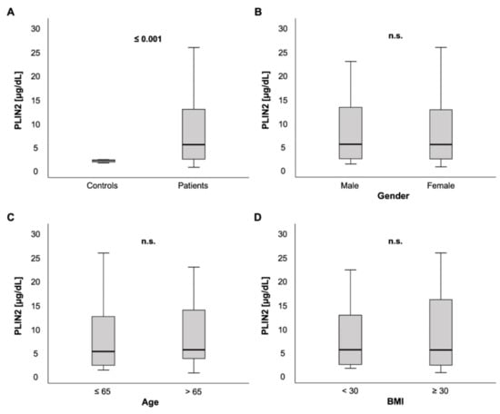 Furthermore, PLIN2 serum levels did not differ in patients with and without chronic obstructive pulmonary disease (COPD) (3.5 (0.48–48.3) µg/dL vs. 3.74 (1.68–21.3) µg/dL, p = 0.974; Figure 2D).