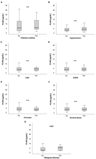 To further understand the applicability of PLIN2, we performed a comprehensive analysis of various components of ICU parameters and organ dysfunction. Most components of the SOFA score, i.e., defining cardiovascular, hepatic, renal and coagulation failure, did not show consistent correlations with serum PLIN2. By comparison, we were surprised about the finding that patients with a Horovitz quotient ≤100 presented with decreased PLIN2 levels. We suspect that during a state of severe critical illness and subsequent intense ventilation and medication support, compared to mild or moderate critical illness, PLIN2 expression could be downregulated due to multiple reasons that are difficult to dissect in such a setting. Moreover, this may also be a phenomenon of serious dysregulation of metabolism in moribund patients. Taken together, we were not able to define a relevant driving force associated with the observed changes in PLIN2 serum concentrations. Therefore, we next investigated whether changes in serum PLIN2 were associated with the presence of various comorbidities: (a) cardiovascular disease, (b) hepatic disease, (c) pancreatic disease, and (d) malignant disease.