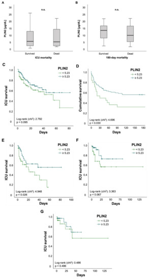 - Prompted by experimental research connecting changes in PLIN2 serum levels with hepatic diseases and alcohol consumption [20,21,54,56], we analyzed serum PLIN2 concentrations in ICU patients suffering from liver cirrhosis and patients with a history of alcohol abuse. However, we did not observe any connections between cirrhosis or alcohol abuse and PLIN2 levels. However, this may be due to missing statistical power because only 3.1% of our cohort had cirrhosis. Additionally, the majority of the mentioned studies assessed PLIN2 in NAFLD or non-alcoholic steatohepatitis (NASH) instead of cirrhosis, further reducing the comparability of the results.